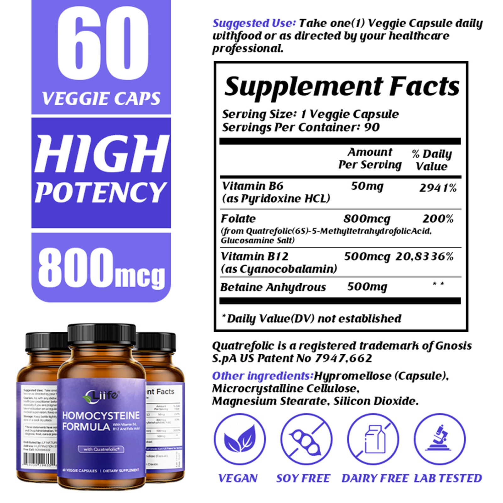 - 60-Day Supply 60 vegan capsules per bottle (1 capsule/day) offer long-lasting support. With B6 and B12 far exceeding daily needs, this concentrated formula outperforms single-ingredient supplements, delivering 50%+ better value for daily homocysteine management.